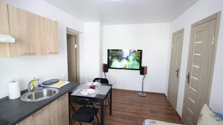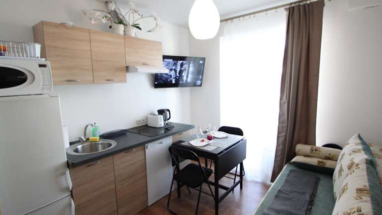 Die Wohneinheiten verfügen über eine voll ausgestattete Küche mit Kühlschrank, Geschirrspüler, Mikrowelle, Herdplatte, Toaster und Wasserkocher. Es sind keine spezifischen Informationen über Verpflegungsmöglichkeiten vorhanden.