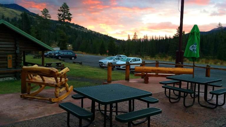 Die Lodge liegt mitten in der Natur und in der Einsamkeit am North Fork Highway in Wyoming, nur 1-2 Meilen vom Osteingang des Yellowstone Nationalparks entfernt. Die 40 Zimmer verteilen sich auf mehrere rustikale Holzgebäude auf einer großen, parkähnlichen Anlage. Ein Restaurant mit Bar, eine Tankstelle und ein kleiner „Tante-Emma-Laden“ gehören dazu. Eine Lobby gibt’s nicht, Rezeption ist im Souvenirgeschäft im…
