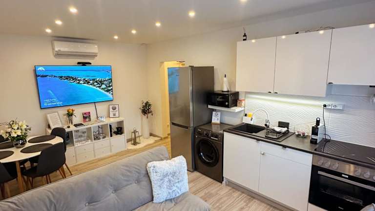 Die Ferienwohnung verfügt über 2 Schlafzimmer, ein Wohnzimmer, eine voll ausgestattete Küche mit Kühlschrank und Kaffeemaschine sowie ein Badezimmer mit Bidet und Dusche. Handtücher und Bettwäsche werden zur Verfügung gestellt.