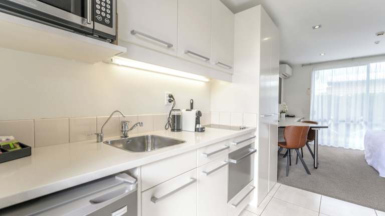 Die Apartments sind mit einer Designer-Küchenzeile ausgestattet, die einen Geschirrspüler, eine Mikrowelle und einen Kühlschrank umfasst. Zudem besteht die Möglichkeit, Essen liefern zu lassen. Es wird darauf hingewiesen, dass alle Geschirrteile desinfiziert werden.