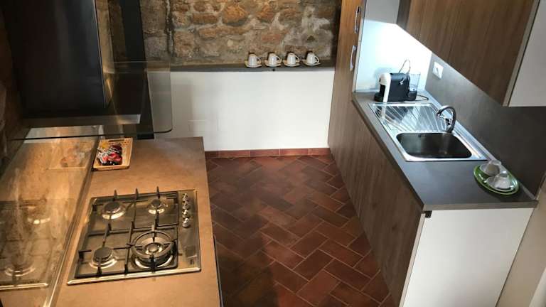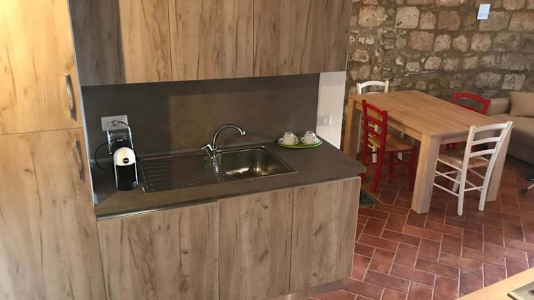Die Ferienwohnung besteht aus einem Schlafzimmer, einem Wohnzimmer und einem Badezimmer mit Bidet und Dusche. Die Küche ist mit Kühlschrank und Kaffeemaschine ausgestattet. Die Zimmer bieten zudem einen schönen Blick auf den Garten und sind klimatisiert.