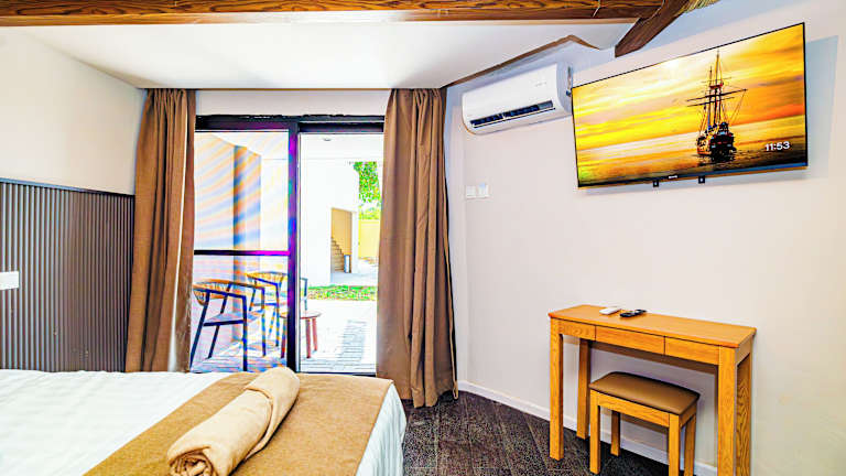 Die Zimmer sind klimatisiert und verfügen über einen Balkon oder eine Terrasse mit Meerblick. Sie bieten Platz für ein Doppelbett oder ein Queensize-Bett, einen Safe, eine Minibar und einen Schreibtisch. Zu den weiteren Annehmlichkeiten gehören ein TV-Gerät mit Satellitenempfang sowie kostenloses Wifi. Die Badezimmer sind mit Dusche und Badewanne ausgestattet. Es gibt auch rollstuhlgerechte Zimmer mit barrierefreiem Badezimmer.