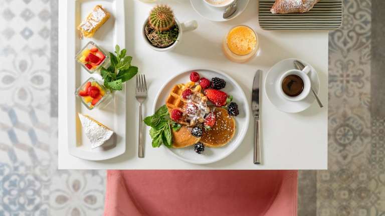 Beim Frühstück werden verschiedene Optionen in Form eines Buffets angeboten, darunter kontinentale sowie englische/irische Speisen.