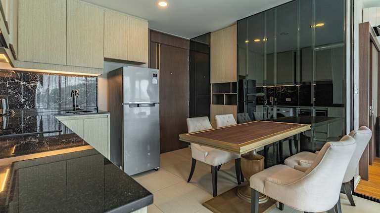 Die Wohneinheiten sind mit einer voll ausgestatteten Küche versehen, die unter anderem einen Kühlschrank, eine Mikrowelle, einen Toaster sowie einen Wasserkocher beinhaltet. Zusätzliche Verpflegungsmöglichkeiten sind nicht erwähnt.
