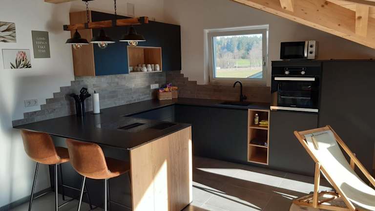 Die Unterkunft verfügt über zwei Schlafzimmer, ein Badezimmer, Bettwäsche und Handtücher. Ein Flachbild-TV mit Kabelkanälen sowie ein Essbereich und eine voll ausgestattete Küchenzeile sind vorhanden, ergänzend bietet eine Terrasse einen schönen Ausblick auf die Berge.