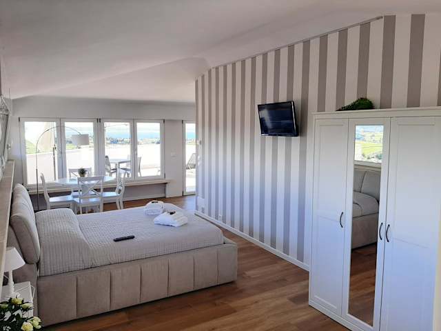 Verbringen Sie einen traumhaften Aufenthalt in der Panoramic Suite in Cavaion Veronese. Das klimatisierte Studio-Apartment bietet eine Terrasse mit Seeblick und ist mit modernen Annehmlichkeiten ausgestattet. Genießen Sie die Nähe zu Garda, Verona und Sirmione und lassen Sie sich von der atemberaubenden Umgebung verzaubern.