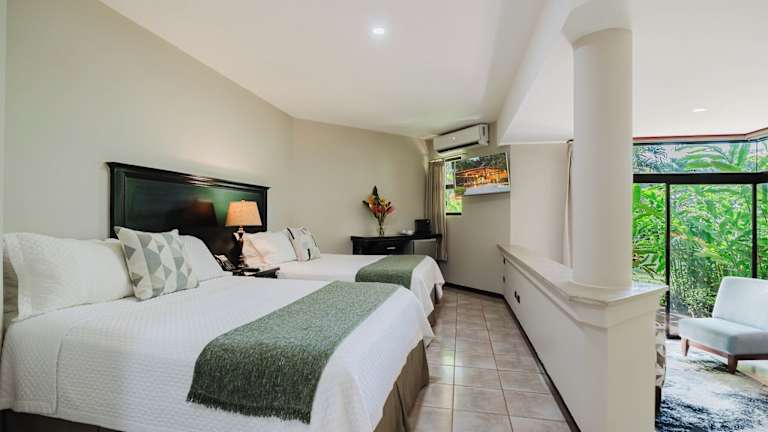 Die Zimmer sind klimatisiert und befinden sich in einem heimeligen Ambiente. Sie sind ausgestattet mit einem Sofabett, Safe, Minibar, Kühlschrank, Tee-/Kaffeemaschine sowie Telefon, Sat-TV und kostenlosem WiFi. Die Badezimmer sind mit einer Dusche, einem Haartrockner und einem Telefon ausgestattet. Rollstuhlgerechte Zimmer sind ebenfalls buchbar.