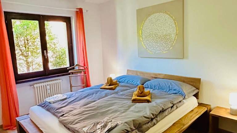 Die Ferienwohnung bietet Platz mit 2 Schlafzimmern, einem Wohnzimmer und einer gut ausgestatteten Küche, die unter anderem einen Kühlschrank und einen Ofen umfasst. Ein modernes Badezimmer mit Dusche, Flachbild-TV sowie die Bereitstellung von Handtüchern und Bettwäsche runden die Ausstattung ab.