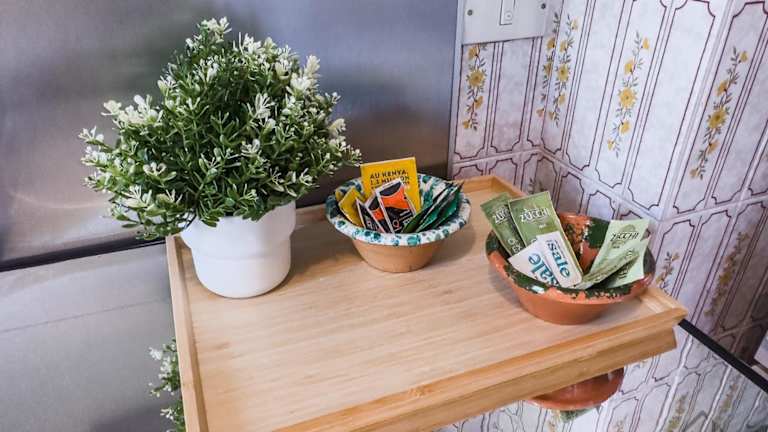 Die Ferienwohnung bietet Platz in einem Schlafzimmer und einem Wohnzimmer. Die voll ausgestattete Küche enthält einen Kühlschrank und eine Kaffeemaschine. Das Badezimmer ist mit einem Bidet und einer Dusche ausgestattet. Handtücher und Bettwäsche werden bereitgestellt.