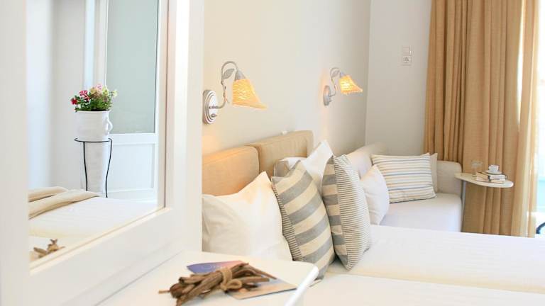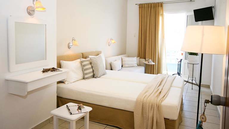 Die klimatisierten Zimmer des Paradissos Hotels sind mit einem Kleiderschrank, einem Wasserkocher, einem Kühlschrank und einem TV ausgestattet. Jedes Zimmer verfügt zudem über eine Terrasse und ein eigenes Badezimmer mit einer Dusche.