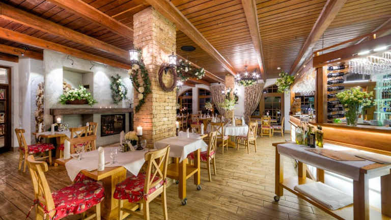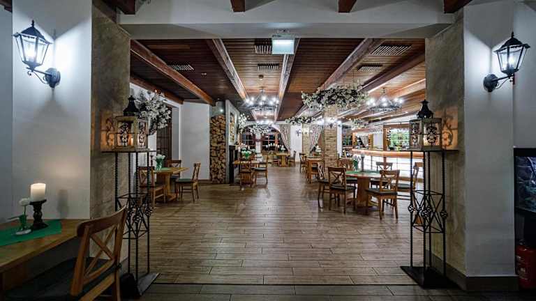 Das geräumige, klimatisierte Restaurant bietet À-la-carte-Gerichte und ist auf polnische sowie regionale Küche spezialisiert. In der Sommersaison besteht die Möglichkeit, im Aussenbereich zu speisen und zu grillen. Zudem gibt es eine Snackbar und ein Café vor Ort.