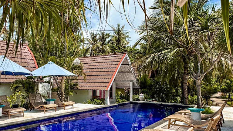 Die Pelangi Cottages Gili Air liegen weniger als 5 Gehminuten vom Strand entfernt auf der Insel Gili Air im nördlichen Lombok. Die Insel ist bekannt für ihre atemberaubenden Strände und ihr klares türkisfarbenes Wasser. Der Hafen von Bangsal ist mit einer 30-minütigen Bootsfahrt erreichbar und von der Insel Bali aus dauert die Bootsfahrt etwa 2 Stunden. Die Lage des Hotels bietet Ihnen die Möglichkeit, die Schönheit der Insel zu erkunden und die umliegenden Korallenriffe beim Schnorcheln zu entdecken.