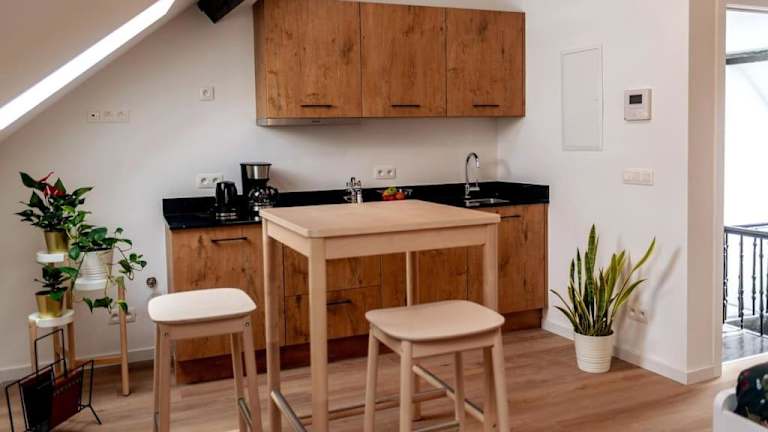 In jeder Wohneinheit ist eine voll ausgestattete Küche vorhanden, die es Gästen ermöglicht, ihre Mahlzeiten selbst vorzubereiten. Diese verfügt über einen Esstisch, einen Kühlschrank, eine Herdplatte sowie eine Kaffeemaschine und einen Wasserkocher.
