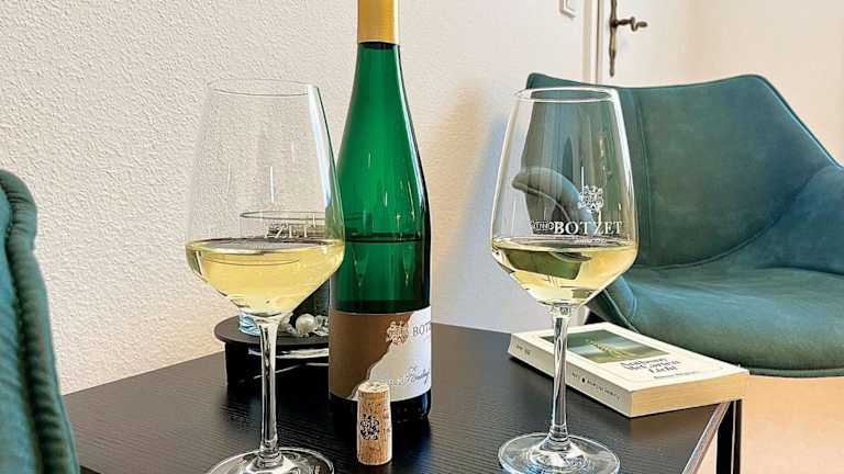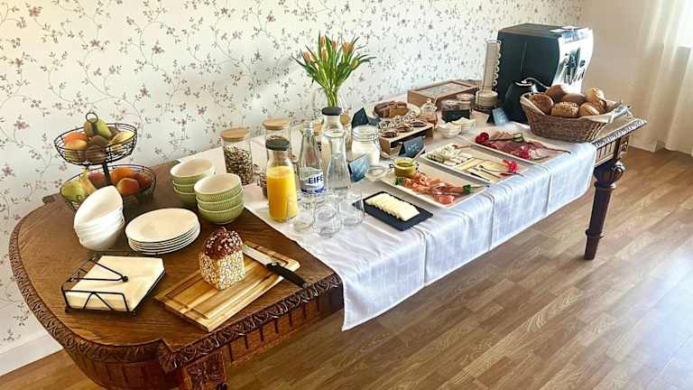 Gäste der Pension 1595 im Weingut Botzet können ein als Buffet angebotenes Frühstück geniessen. Das Frühstück ist frisch zubereitet und bietet eine Auswahl, die den Start in den Tag erleichtert.