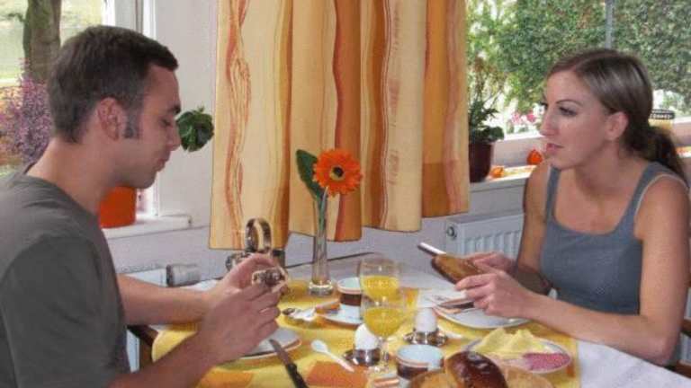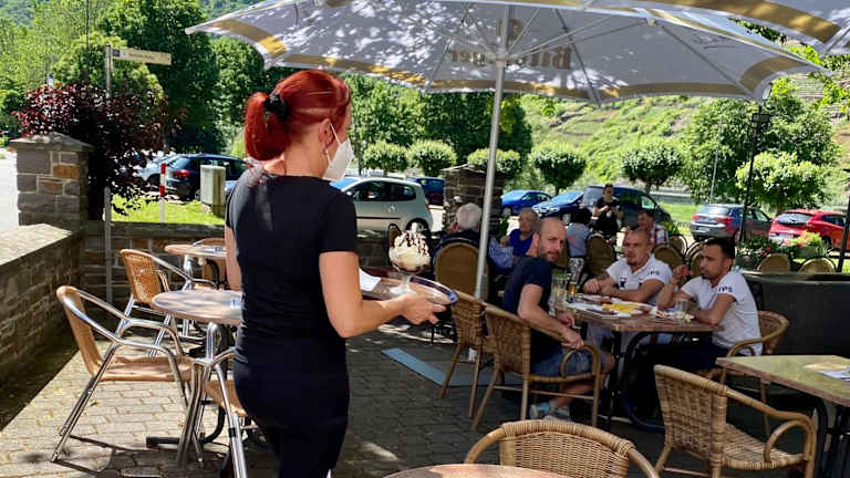 Im Café der Pension Dören wird morgens ein Frühstücksbuffet mit frisch gebackenem Brot aus der hauseigenen Bäckerei angeboten. Bei sommerlichen Temperaturen können Gäste Getränke und Snacks auf der Terrasse geniessen.