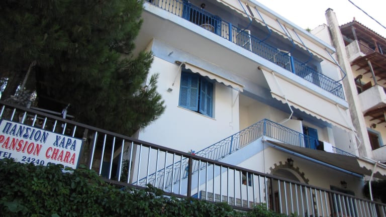 Die Pension Hara in Patitiri auf der Insel Alonnisos ist ein charmantes Hotel, umgeben von Pinien und mit einem malerischen Blick auf die Ägäis und die Altstadt. Die klimatisierten Zimmer sind einfach, aber gemütlich eingerichtet und verfügen über eine möblierte Terrasse. In der Nähe finden Sie eine Vielzahl von Restaurants und Cafés, die lokale Spezialitäten servieren. Das Hotel bietet auch einen Mietwagenservice und Informationen über die malerische Altstadt von Alonnisos.