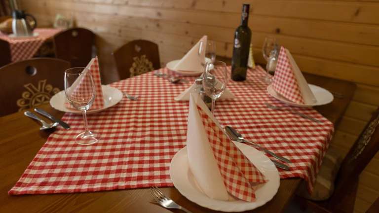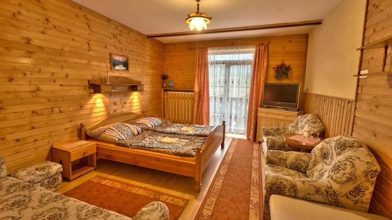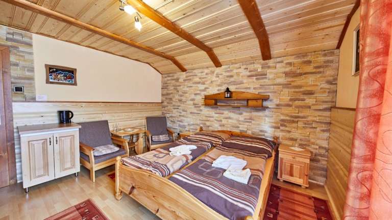 Morgens steht ein reichhaltiges Frühstücksbuffet bereit. Die Gäste haben Zugang zu einer Gemeinschaftsküche sowie einem Loungebereich im Bergstil mit offenem Kamin. Die slowakische Küche wird in der Pension angeboten, und es gibt auch die Möglichkeit, lokale Gerichte zu geniessen.