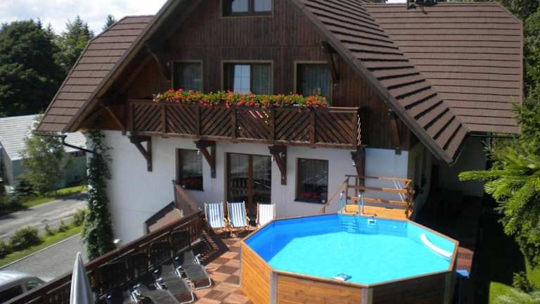 Die Pension Holubec in Benecko ist eine gemütliche Unterkunft, die mit einer gut ausgestatteten Gemeinschaftsküche und einem großen Garten mit saisonalem Pool, Trampolin, Badmintonnetz und Grillmöglichkeiten punktet. Das kostenlose WLAN in der gesamten Unterkunft ermöglicht es den Gästen, stets online zu sein. Die Zimmer sind mit einem TV, einem Kühlschrank und einem eigenen Bad ausgestattet. Parkplätze sind vorhanden und gesichert. Das Frühstück wird in der Pension serviert und es gibt ein Restaurant in unmittelbarer Nähe. Einkaufsmöglichkeiten sind ebenfalls in der Nähe. Skilifte und Skigebiete sind gut erreichbar.