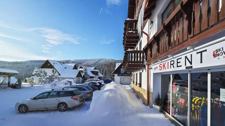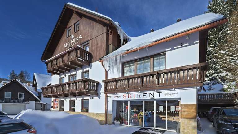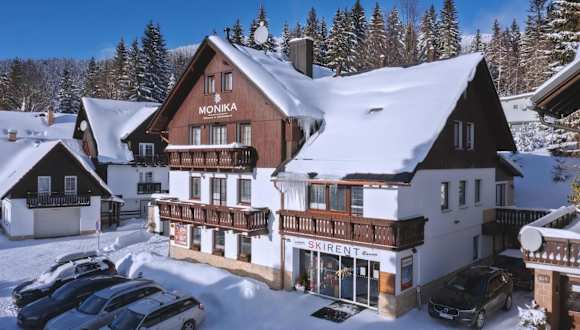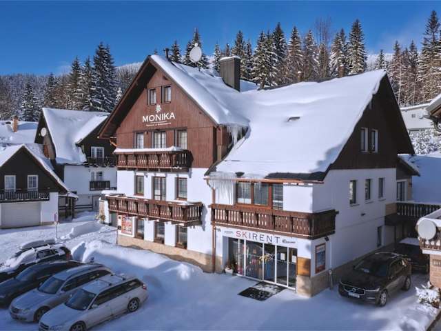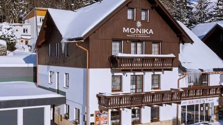 Die Pension MONIKA liegt in einer ruhigen Lage und ist weniger als 10 Gehminuten vom Zentrum von Špindlerův Mlýn entfernt. Die Lage ist ideal für alle, die die Natur und die Aktivitäten in der Umgebung genießen möchten. Hinter der Unterkunft verlaufen Langlaufloipen und Radwege, die zu Erkundungstouren einladen. In der Nähe gibt es auch Außen- und Hallentennisplätze sowie eine Bowlingbahn. Die Skipisten und Schwimmbäder sind nur 400 m von der Unterkunft entfernt.