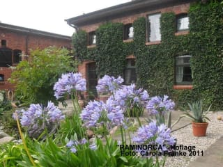 Inmitten einzigartiger Natur-Idylle, fernab jeglicher Lärmattacken und Luftverschmutzung, haben wir unsere eigene »Insel« geschaffen: Einen denkmalgeschützten Drei-Seiten-Hof in Ramin, von uns liebevoll »RAMINORCA« genannt. Von 2001 bis 2008 liebevoll saniert und im mediterranen Stil angelegt, bietet dieser heute, in ruhiger Dorflage mit unverbaubarem Fernblick auf die angrenzenden Felder, ein gepflegtes und stilechtes Ambiente mit parkähnlichem Skulpturengarten und so manchem historischen und künstlerischen Detail. Lassen Sie sich also verzaubern, vom Charme der über hundert Jahre alten Backsteinbauten, verbunden mit dem Flair modernen Komforts. Etwa 600 qm umschlossener Innenhof mit Teichanlage und PKW-Stellplatz, überdachtem Fahrradstellplatz und separaten Sitzecken bilden den Eingang zu weiteren 2200 qm Terrain mit Liegewiese, Feuerstelle und Erholungszonen. Schauen Sie der Eigentümerin bei der Gestaltung verschiedenster kreativer Ideen über die Schulter oder lassen Sie sich inspirieren eigene Fähigkeiten auszuprobieren und unter sachkundiger Anleitung gar Ihr eigenes Urlaubsmitbringsel zu fertigen.
