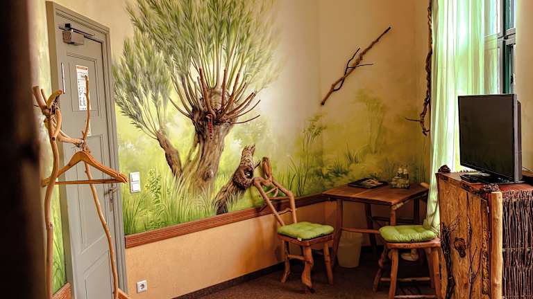 Pension Spreewelten Unsere Kunstwerke Tauchen Sie ein in die Sagenwelt des Spreewaldes, erleben Sie das "Gemach des Wendenkönigs" oder die Eisenbahnromantik des Spreewaldexpresses "Abteil Miss Marple". Elf Zimmer - Elf Welten mit bezaubernden Namen werden jeden Gast in eine andere Welt versetzen und die Übernachtung zu einem unvergesslichen Erlebnis machen. Nach 140 Jahren hat dieses alte, aber noch betriebene, Gebäude endlich einen ihn gebührenden Inhalt bekommen, einen ganz einzigartigen und so noch nie gesehenen. Jedes unserer elf Zimmer wurde von verschiedenen Künstlern zum Thema „Spreewald“ gestaltet und befindet sich im noch betriebenen Bahnhofsgebäude Lübbenaus. Unser Bahnhof liegt an einer aktiven Fahrstrecke und wird von zwei Linien (RE 2 und RB 24) bedient. Auch Güterverkehr ggf. Schnellzüge befahren diese Strecke. Wir haben Zimmer zu den Gleisen und Zimmer zur Hauptstraße.