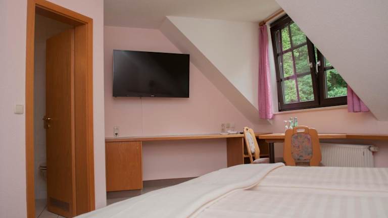 Jedes Zimmer in der Pension Waldfrieden ist ausgestattet mit einem Schreibtisch, einem Flachbild-TV, einem eigenen Badezimmer sowie Bettwäsche und Handtüchern. Die Gästezimmer verfügen darüber hinaus über einen Kleiderschrank, was zusätzlichen Stauraum bietet.