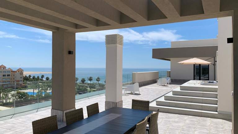 Die Unterkunft Penthouse with wide terrace next to the ocean bietet eine stilvolle Ferienwohnung, die über einen saisonalen Aussenpool, einen Garten und einen eigenen Strandbereich verfügt.
