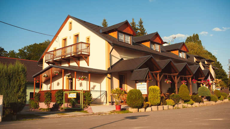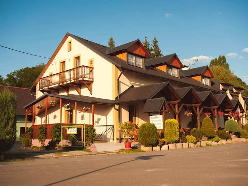 Penzion a autokemp Wolf bietet Übernachtungsmöglichkeiten mit einem heimeligen Garten, einer Gemeinschaftslounge und einer einladenden Terrasse. Die Unterkunft ist ausgestattet mit einer Gemeinschaftsküche, Zimmerservice und Währungsumtausch. WLAN steht den Gästen kostenlos zur Verfügung und einige Zimmer verfügen über einen Balkon. Zudem gibt es einen Kinderspielplatz für die kleinen Gäste.