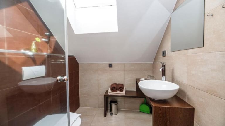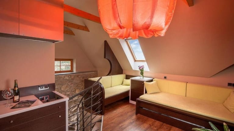 Die modernen Zimmer der Penzion Blanský Les bieten einen komfortablen Aufenthalt mit Blick auf den Garten. Sie sind geschmackvoll eingerichtet und verfügen über einen gemütlichen Sitzbereich sowie ein eigenes Badezimmer. Die Zimmer sind mit Holzböden und Holzmöbeln ausgestattet, die eine warme und einladende Atmosphäre schaffen.
