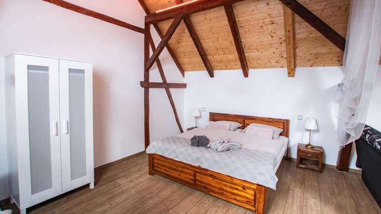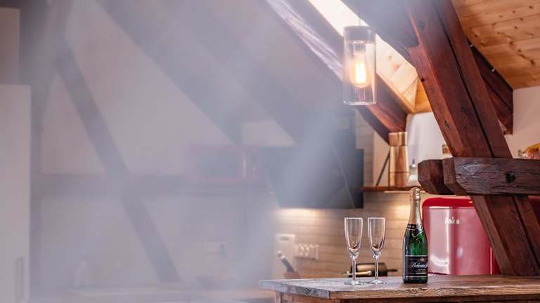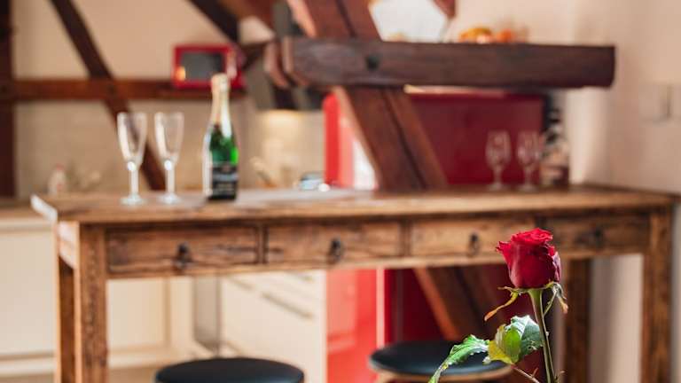 Die Ferienwohnung besteht aus einem Schlafzimmer, einem Wohnzimmer und einer voll ausgestatteten Küche mit Kühlschrank und Kaffeemaschine. Ein Badezimmer mit Dusche und Whirlpool ist ebenfalls vorhanden. Handtücher und Bettwäsche werden bereitgestellt.