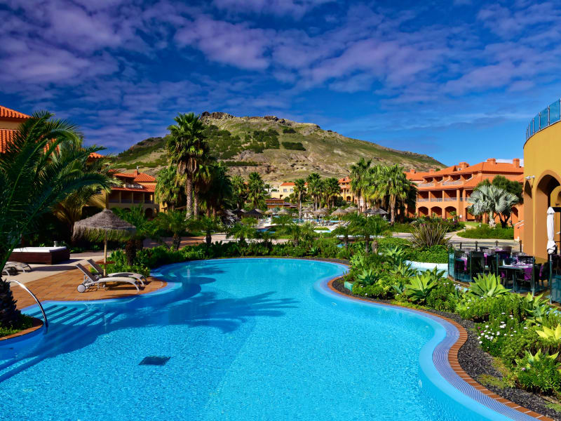 Das Hotel Pestana Porto Santo ist ein 5-Sterne-Strandresort auf der Insel Porto Santo, Madeira. Das Hotel, das Ihnen einen All-Inclusive-Service bietet (Frühstück, Mittag- und Abendessen sowie Snacks und nationale Getränke), wurde kürzlich zum besten All-Inclusive-Resort Europas gekürt. Es befindet sich direkt am besten Strand Portugals, dem Praia do Porto Santo, der durch neun Kilometer feinsten Sand und warmes Wasser besticht. Das Hotel liegt nur eine Minute zu Fuß vom Strand entfernt und verfügt über 2 große Pools, die von üppigen Gärten auf 30.0000 m2 Fläche umgeben sind. Es bietet Ihnen 6 Restaurants und 5 Bars sowie einen SPA-Bereich mit beheiztem Pool, Wasserstrahl‑Bereichen, Sauna, Dampfbad, Hamam und Fitnesscenter. Unsere jüngsten Gäste können sich auf den Sportfeldern sowie im Spielzimmer und Kids Club vergnügen. Die Zimmer sind in den Blautönen des Meeres eingerichtet und mit Flachbildfernseher und Balkon ausgestattet.