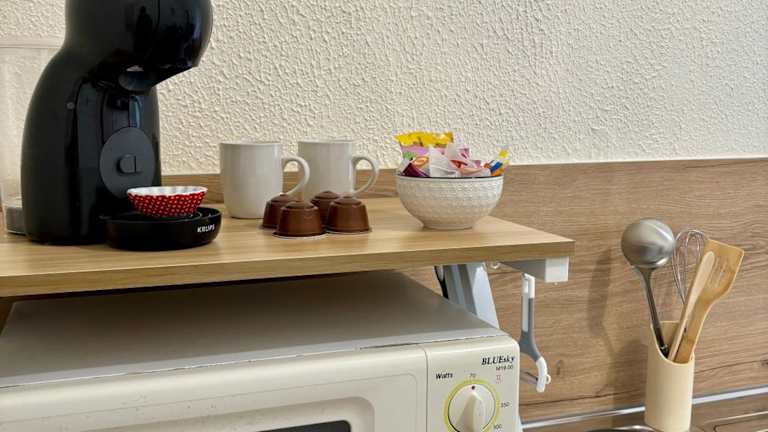 Die Ferienwohnung verfügt über eine voll ausgestattete Küche mit einem Kühlschrank, einer Mikrowelle und einer Kaffeemaschine, was die Zubereitung eigener Mahlzeiten ermöglicht. Handtücher und Bettwäsche werden zur Verfügung gestellt, sodass Gäste sich sofort wohlfühlen können.