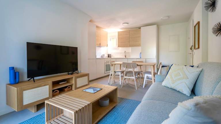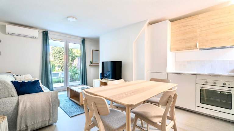 Die Ferienwohnung bietet Platz für bis zu 6 Personen und umfasst 2 Schlafzimmer sowie ein Wohnzimmer. Die voll ausgestattete Küche beinhaltet unter anderem einen Kühlschrank und eine Kaffeemaschine. Darüber hinaus verfügt die Unterkunft über ein Badezimmer mit Dusche und Haartrockner. Handtücher und Bettwäsche werden bereitgestellt. Zu den weiteren Annehmlichkeiten zählen Klimaanlage, Balkon und kostenfreies WLAN.