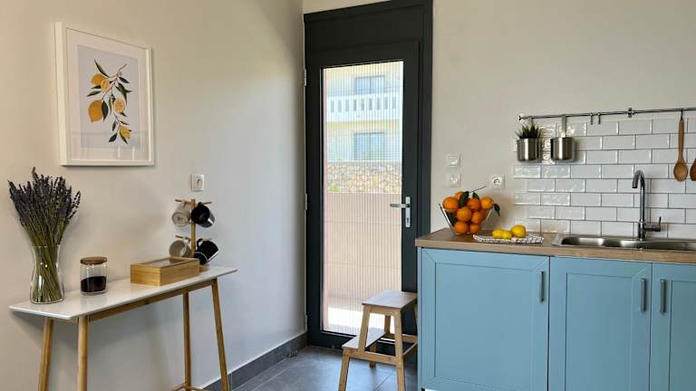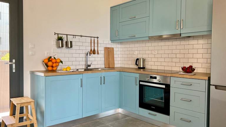 Die Unterkunft verfügt über eine voll ausgestattete Küche mit Kühlschrank, Ofen, Herdplatte, Toaster, Kaffeemaschine und Wasserkocher. Es gibt einen Sitzbereich, der zum Verweilen einlädt.