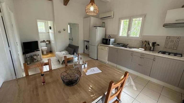 Das Ferienhaus ist klimatisiert und verfügt über ein Schlafzimmer sowie einen Flachbild-TV. Die Küche ist mit einem Kühlschrank und einem Geschirrspüler ausgestattet. Handtücher und Bettwäsche sind in der Unterkunft vorhanden.