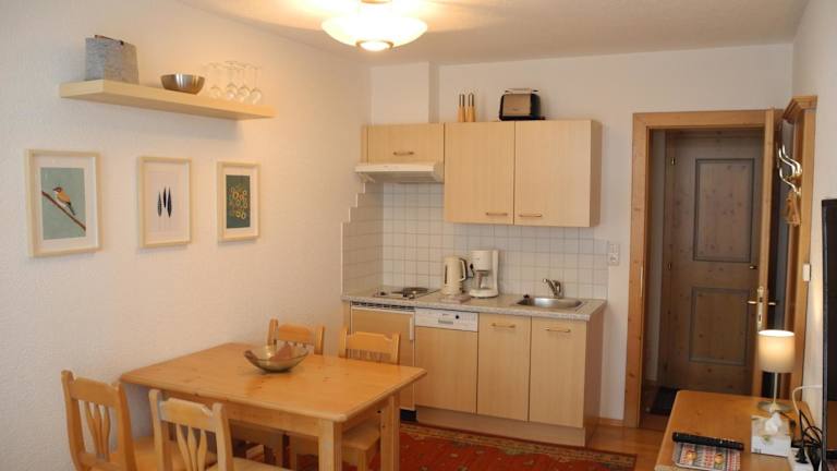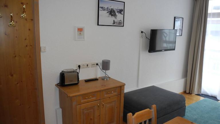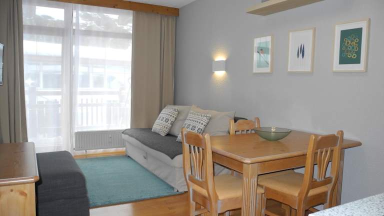 Die Ferienwohnung verfügt über ein Schlafzimmer, ein Wohnzimmer, ein Badezimmer mit Dusche sowie eine gut ausgestattete Küchenzeile mit Kühlschrank und Geschirrspüler. Ein Balkon mit Bergblick ist ebenfalls vorhanden. Handtücher und Bettwäsche werden bereitgestellt. Die Unterkunft bietet Nichtraucherzimmer und eine Skiaufbewahrung.
