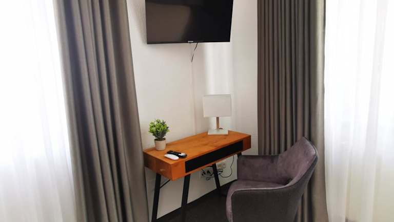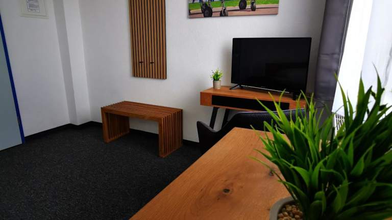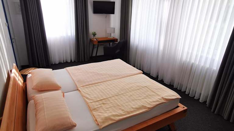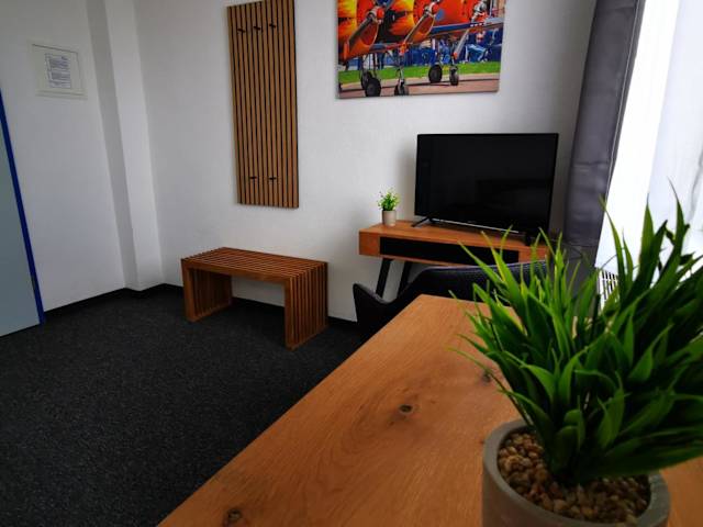 Die Zimmer in der Pilotenunterkunft Fliegerhorst sind mit einem Schreibtisch sowie einem eigenen Badezimmer ausgestattet. Bettwäsche ist ebenfalls vorhanden.