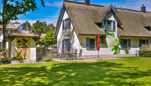 Die Pirateneiche steht in einer neu gebauten Ferienhausanlage direkt am Dünenwald mit mehreren für diese Landschaft typischen Reetdachhäusern. Mit der Gemeinde Glowe erwartet Sie ein wunderschöner Badeort, direkt an der Ostsee gelegen. Lassen Sie sich in einem der zahlreichen Restaurants kulinarisch verwöhnen. Viele davon liegen in traumhafter Lage mit Blick auf die Ostsee! Im Ort befindet sich ein Supermarkt. Nette kleine Geschäfte, teilweise mit Kunsthandwerk, warten auf Ihren Besuch. Auch verschiedene Bäcker und Eiscafés laden zum Verweilen ein. Lernen Sie dieses wunderbare Fleckchen mit seiner einzigartigen Landschaft kennen und verbringen Sie unvergessliche und erholsame Tage in Glowe. Die Schaabe, ein über zehn Kilometer langer schmaler Landstreifen mit einem der längsten und schönsten Strände der Insel Rügen. Auf der einen Seite der herrliche weiße Sandstrand, auf der anderen Seite den Schwarzkiefern, Birken und Eichen. Der Strand ist aufgrund seiner Breite und des seichten Ufers ideal für Kinder geeignet. Sie schauen bis zum Kap Arkona und die gesamte Bucht entlang. Auf dem Hundestrand können Sie mit Ihren Lieblingen ausgiebig Sonne und Meer genießen.