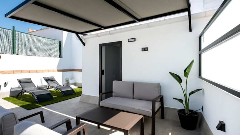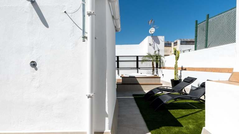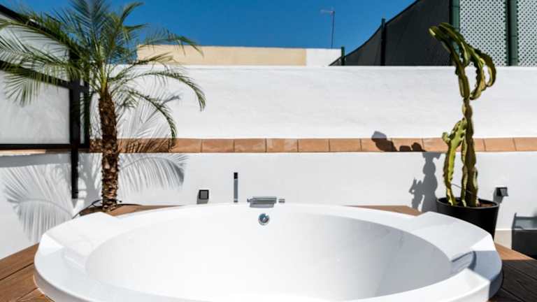 Die Ferienwohnung Pj Terraza Privada Bañera exterior junto Catedral bietet einen Aussenpool und eine Terrasse. Die helle, einladende Unterkunft ist ideal für einen angenehmen Aufenthalt in Sevilla.