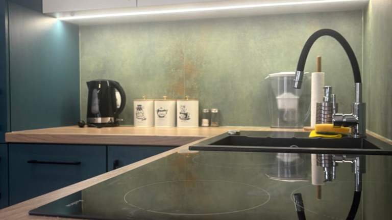 Die Ferienwohnung umfasst ein Schlafzimmer, ein Wohnzimmer sowie eine voll ausgestattete Küche mit Kühlschrank und Wasserkocher. Ein Badezimmer verfügt über eine Dusche und einen Haartrockner. Handtücher und Bettwäsche sind inbegriffen.