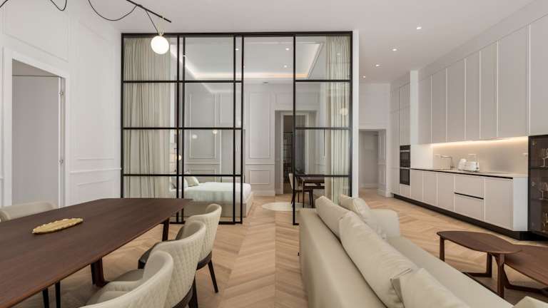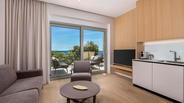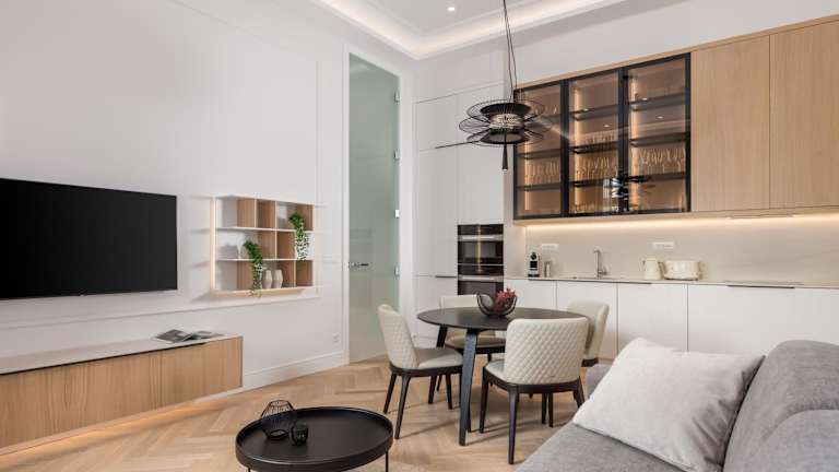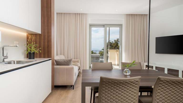 Die Apartments sind mit einer voll ausgestatteten Küche versehen, die über einen Essbereich, einen Kühlschrank, einen Geschirrspüler, einen Ofen, eine Kaffeemaschine und einen Wasserkocher verfügt.