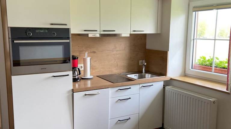 Die Ferienwohnung besteht aus einem Schlafzimmer, einem Wohnzimmer und einer voll ausgestatteten Küche, die über einen Kühlschrank und eine Kaffeemaschine verfügt. Des Weiteren beinhaltet die Unterkunft ein Badezimmer mit Dusche und Haartrockner. Handtücher und Bettwäsche werden bereitgestellt. Ein Kinderspielplatz ist ebenfalls vorhanden.