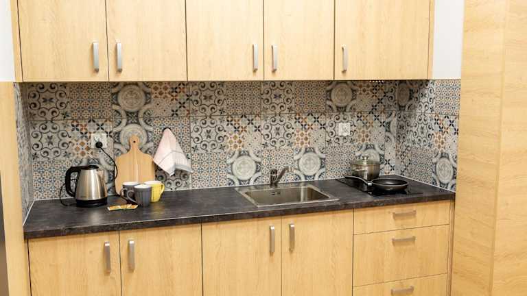 Die Unterkunft verfügt über eine voll ausgestattete Küchenzeile mit einer Herdplatte und einem Wasserkocher, was den Gästen ermöglicht, eigene Mahlzeiten zuzubereiten. Es sind keine Verpflegungsmöglichkeiten erwähnt.