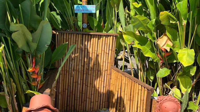 Das Frühstücksbuffet wird in einem hellen, farbenfrohen Raum serviert, der mit handgefertigten Möbeln ausgestattet ist. Es umfasst ein reichhaltiges Angebot an exotischem Obst sowie verschiedene Sorten Brot, Kuchen und Gebäck.