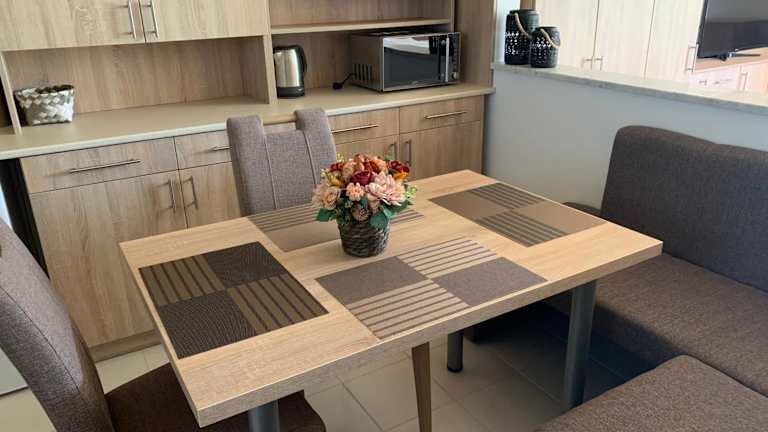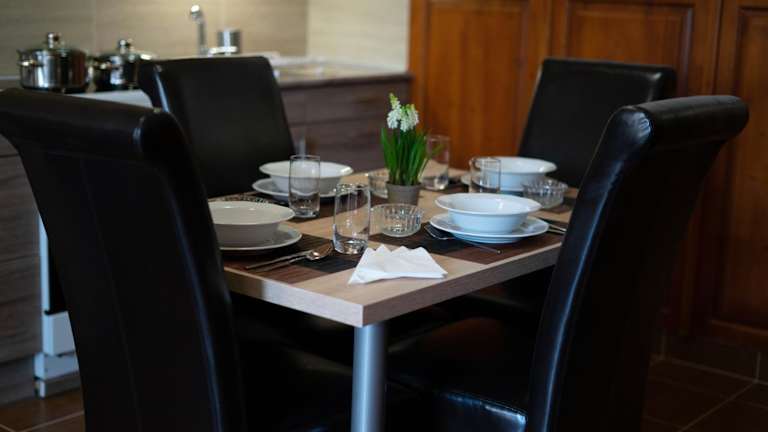 Die Wohneinheiten beinhalten eine voll ausgestattete Küche mit Kühlschrank, Ofen, Mikrowelle, Kaffeemaschine und Wasserkocher. Ein Esstisch ist ebenfalls vorhanden, sodass Gäste gemeinsam speisen können.