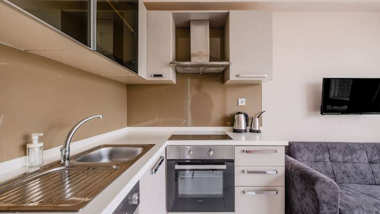 Die Zimmer sind komfortabel gestaltet und verfügen über eine Küche, ein Badezimmer mit Dusche, Klimaanlage sowie ein Doppelbett und ein Sofabett. Ein Kühlschrank, eine Mikrowelle und eine Tee-/Kaffeemaschine sind ebenfalls vorhanden. Zusätzlich sind ein Bügelset, ein Telefon und ein TV-Gerät sowie kostenfreies Wifi in den Zimmern verfügbar.