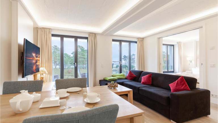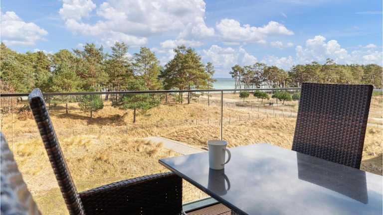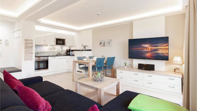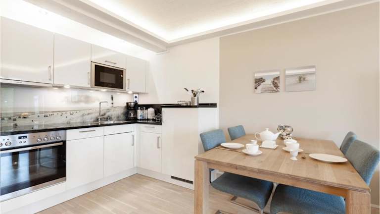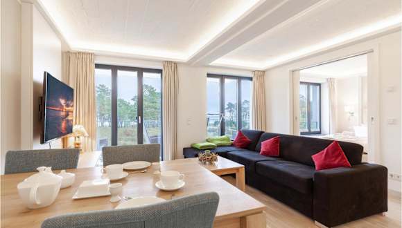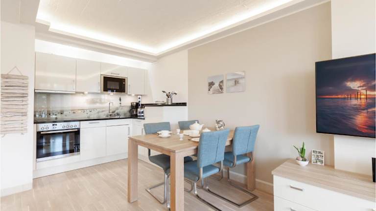 Die Ferienwohnung im Hotel verfügt über ein Schlafzimmer, ein Wohnzimmer mit TV sowie einen Balkon mit Meerblick. Die gut ausgestattete Küche beinhaltet einen Kühlschrank und Geschirrspüler. Das Badezimmer ist mit einer Dusche ausgestattet.