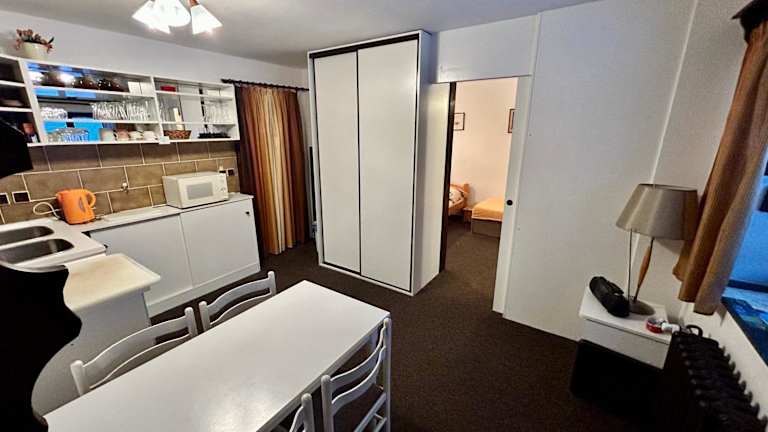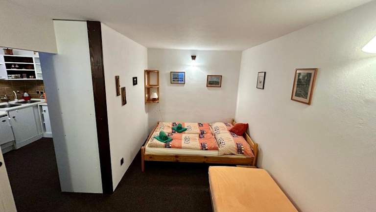 Die Ferienwohnung umfasst ein Schlafzimmer und ist mit einem Flachbild-TV sowie einer Küchenzeile ausgestattet, was eine selbständige Verpflegung ermöglicht.