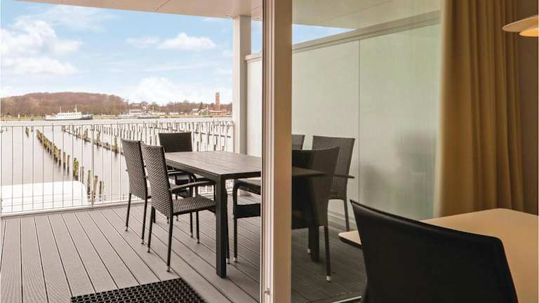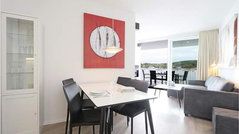 Die Ferienwohnung verfügt über ein Schlafzimmer, ein Wohnzimmer, einen TV und eine gut ausgestattete Küche mit Kühlschrank und Geschirrspüler. Ein Badezimmer mit Dusche sowie ein Balkon mit Meerblick runden das Angebot ab.