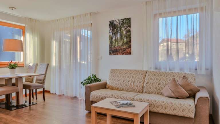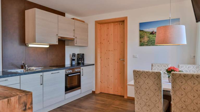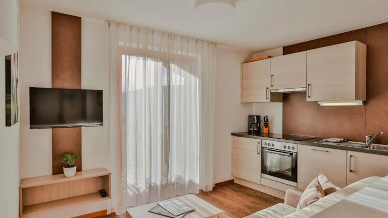 Jede Wohneinheit im Prünsterhof Schenna ist ausgestattet mit einem Balkon, der einen Blick auf die Stadt bietet. Die Zimmer verfügen über einen Satelliten Flachbild-TV, eine gut ausgestattete Küche, ein eigenes Badezimmer mit Dusche und Haartrockner, sowie Annehmlichkeiten wie Kühlschrank, Geschirrspüler, Ofen, Kaffeemaschine und Wasserkocher.
